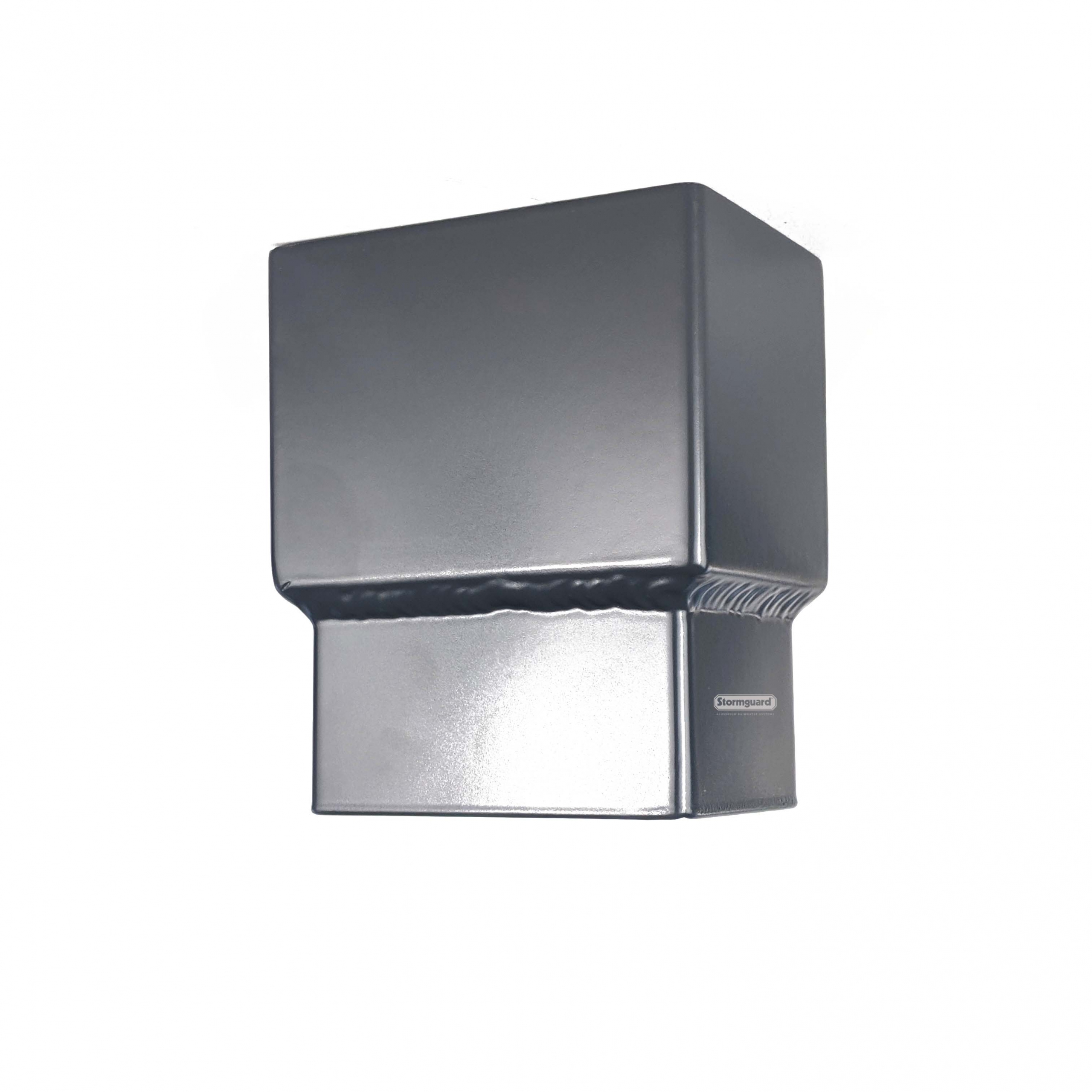 Side view of a grey patch outlet to suit 4x3" rectangular aluminium rainwater downpipeThrough view of black patch outlet to suit 63mm diameter aluminium rainwater downpipe